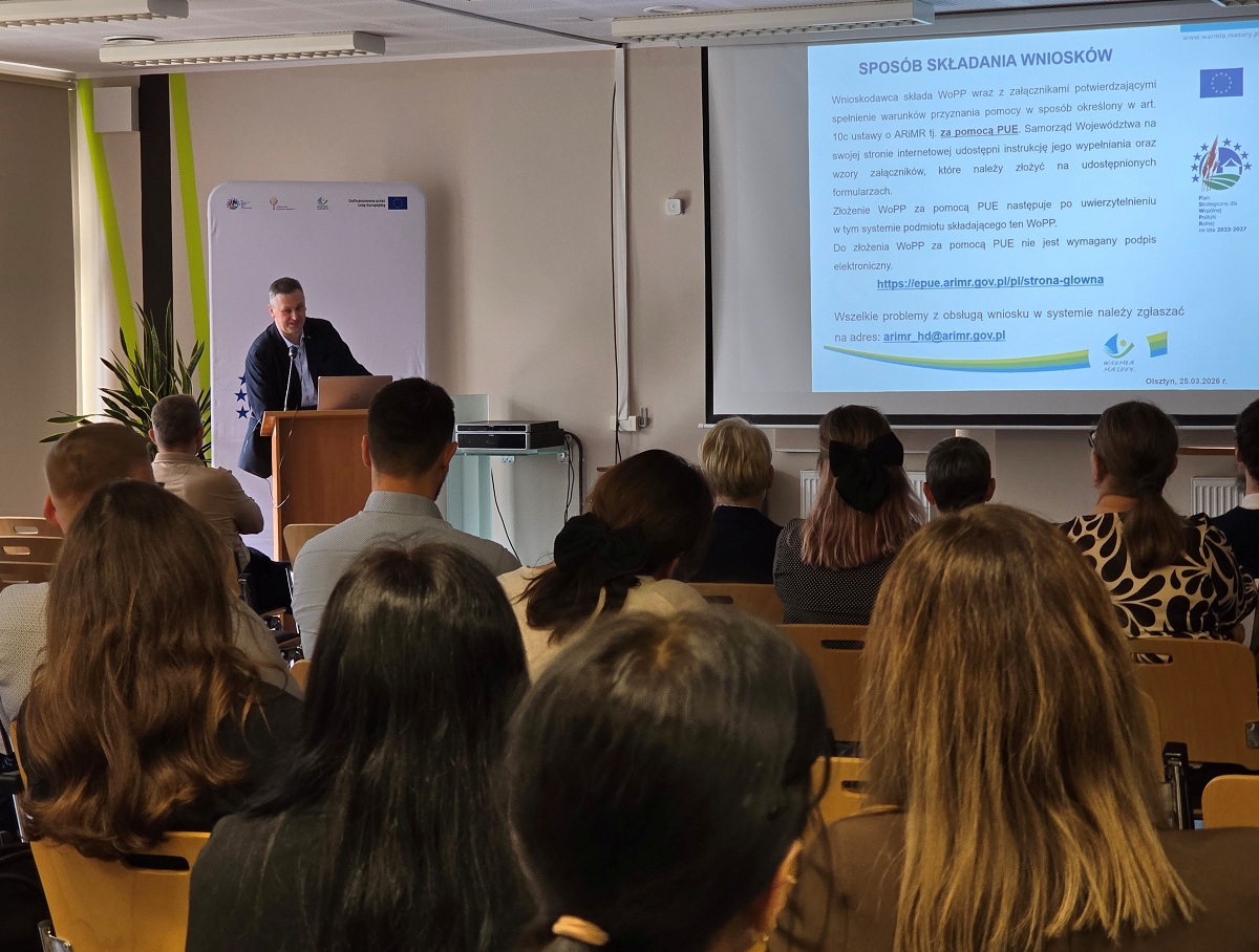 25 marca 2026 r., w siedzibie Departamentu Rolnictwa i Rozwoju Wsi, przy ulicy Jagiellońskiej 91A w Olsztynie, odbyło się spotkanie szkoleniowo-informacyjne dla potencjalnych wnioskodawców Planu Strategicznego dla Wspólnej Polityki Rolnej na lata 2023-2027. Spotkanie zorganizowane zostało w związku z ogłoszonym w terminie od 25 marca 2026 r. do 30 kwietnia 2026 r. naborem wniosków o przyznanie pomocy dla interwencji I.10.10 Infrastruktura na obszarach wiejskich oraz wdrożenie koncepcji inteligentnych wsi – obszar A Inwestycje w zakresie systemów indywidualnego oczyszczania ścieków.